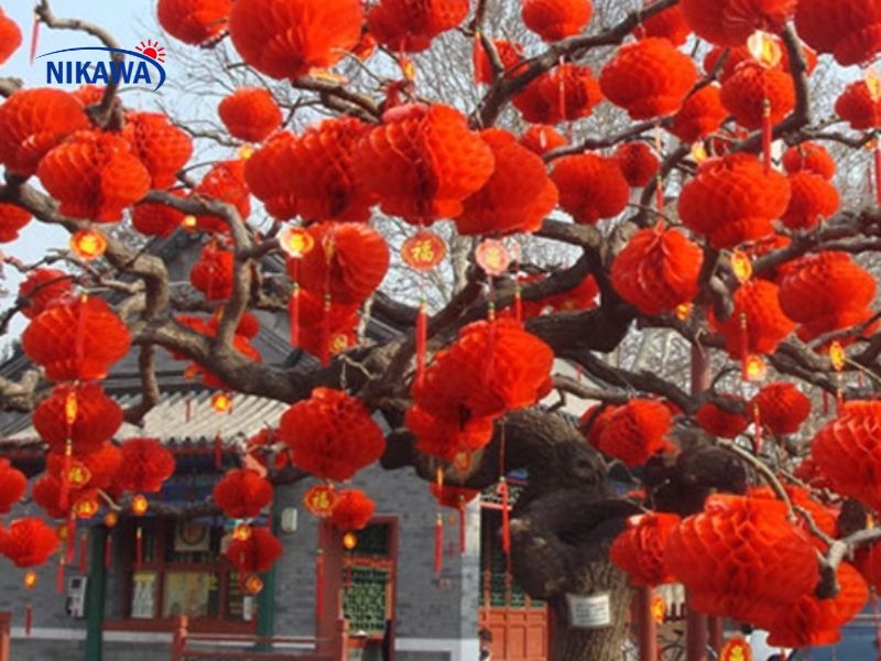 Ngoài trời, đèn lồng sẽ là yếu tố giúp khu vườn, ban công hay sân trước thêm rực rỡ. Trước hết, chọn đèn lồng có chất liệu chịu được thời tiết, tránh dùng giấy mỏng dễ bị ướt. Bạn có thể treo đèn trên cây, cột, hàng rào hoặc trên dây cáp kéo dài giữa các trụ. Để tăng hiệu ứng ánh sáng, nên kết hợp đèn lồng với dây đèn LED hoặc đèn năng lượng mặt trời. Khi treo ngoài trời, đảm bảo dây cáp chắc chắn, móc treo chịu lực tốt và tránh những nơi gió lớn, mưa tạt để đèn không bị rơi. Treo đèn ngoài trời cũng có thể kết hợp với các vật trang trí khác như lồng đèn giấy nhỏ, chim bồ câu giả, hoặc bóng bay ánh sáng, giúp không gian thêm sinh động và bắt mắt hơn.