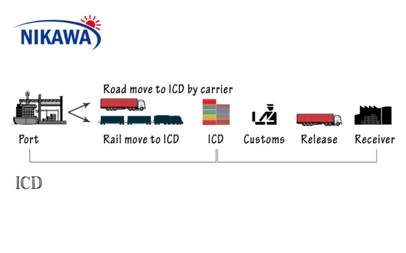 Container hoàn tất thủ tục sẽ được xếp lên xe kéo, tàu hỏa hoặc sà lan để vận chuyển ra cảng chính. Do đã hoàn thành thủ tục tại ICD, khi ra tới cảng biển, container thường được đưa thẳng xuống bãi chờ tàu, giúp tiết kiệm thời gian tối đa.