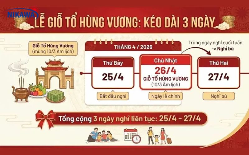 Giỗ Tổ Hùng Vương là một trong những ngày lễ quan trọng của dân tộc, là dịp để mỗi người con đất Việt hướng về cội nguồn, tưởng nhớ công lao dựng nước của các Vua Hùng. Bên cạnh ý nghĩa văn hóa - lịch sử, lịch nghỉ lễ Giỗ Tổ Hùng Vương 2026 cũng được nhiều người quan tâm để sắp xếp thời gian nghỉ ngơi, sum vầy bên gia đình hoặc lên kế hoạch cho những chuyến đi ngắn ngày. Nikawa chúc bạn có một kỳ nghỉ lễ Giỗ Tổ Hùng Vương thật ý nghĩa, an lành và tràn đầy năng lượng!