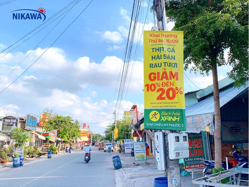 Tiếp theo, bạn cần khảo sát vị trí treo. Nếu treo ở cột điện, tường, hoặc trước cửa hàng, hãy đảm bảo không gian đủ thoáng để banner không bị che khuất. Việc chọn đúng vị trí còn liên quan đến sự an toàn, tránh gây cản trở giao thông hay che khuất tầm nhìn người đi đường.